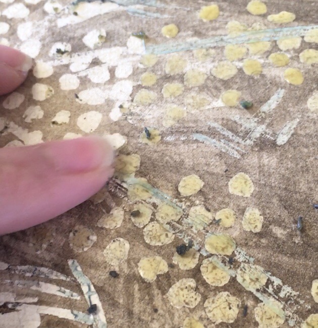 マスキングを指の腹ではがしています。はがし終えたら着彩へ。一般的にマスキングは液とテープがあり、白抜きをしたいときに使用します。木漏れ日やグラスのエッジや雪景色…