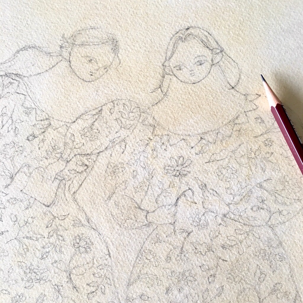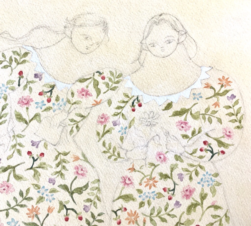 花柄を一旦描き終えました。彼女たちに似合う花柄を目指しました。主題を生かすため、この後ドレスをダークにします。 花柄といえばゴブラン織やアラベスク、ダマスク調…