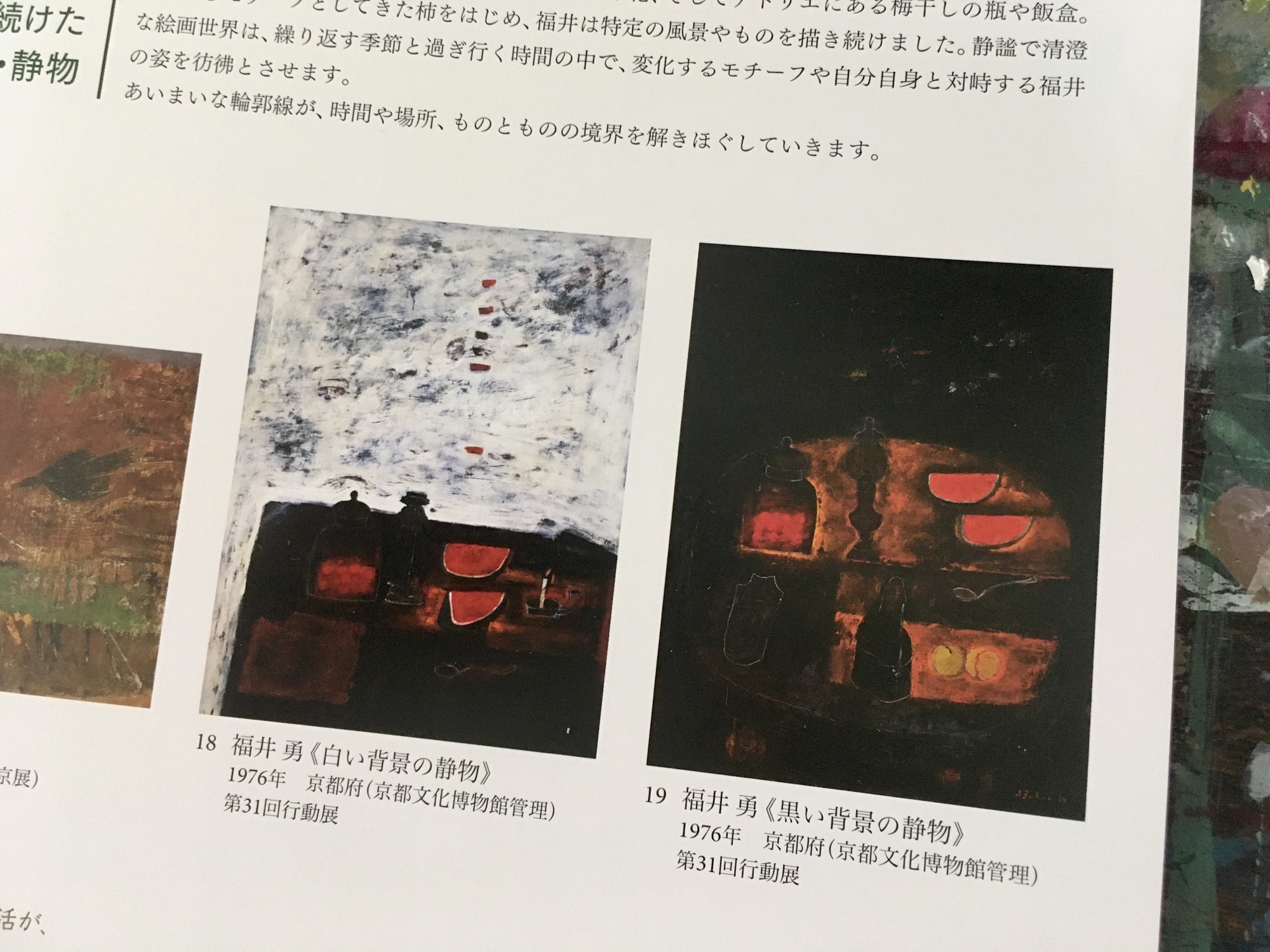 福井勇展 柿、西瓜、柘榴、梅干瓶、飯盒、匙、鶏頭花 モチーフへの眼差しが、とても優しかった。 黒はどこまでも黒く。 効く柿の橙色と西瓜の赤。 やさしく明るい…