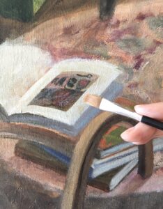 水彩絵具は乾いて水分が抜けると色が落ち着きます。絵に乗せて明るすぎた!と思っても、乾くと馴染んで丁度よかったり。逆に、絵の色に合わせて色を乗せると、乗せた時は馴染んでいても乾くとワントーン暗くなっています。微妙な色の描写では、この現象に何度も引っ掛かりました。学びですな…。なので今日は絵の色ではなく、パレットの色を優先して。