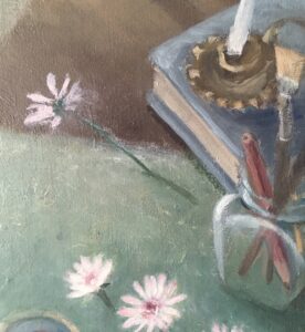 モチーフの選択と配置、構図に長いこと向き合っていましたが、モチーフとしての本ではなく、彼女のリアリティとしての本を描き入れたことで、画面が強くなりました。